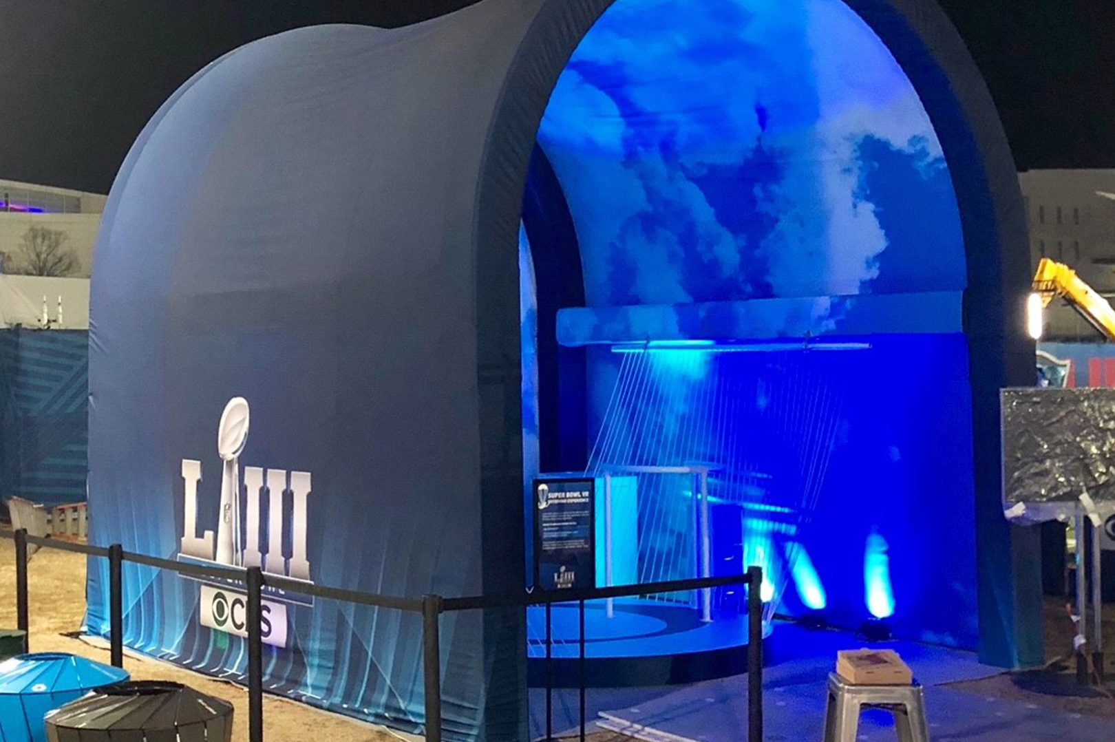 Heated to approximately 400°F, the heat press sublimates the ink from the transfer paper directly into a gaseous state, bypassing the liquid form. Pressure is applied along with the heat and as the ink gasses meet the fabric, the ink transforms back into a solid state resulting in the ink and fabric being chemically bonded together. Once the completed fabric is taken off the heat transfer press, it moves on to our finishing department where clients can choose from services like silicone edges, pole pockets, zipper closures, hems, and more. Colorchrome’s in-house seamstress is skilled at sewing finishing for projects of any size, for trade shows, art exhibits or events like this giant Super Bowl dome below. After any final touches, your project is packaged for pickup or delivery through Colorchrome’s white label fulfillment services.