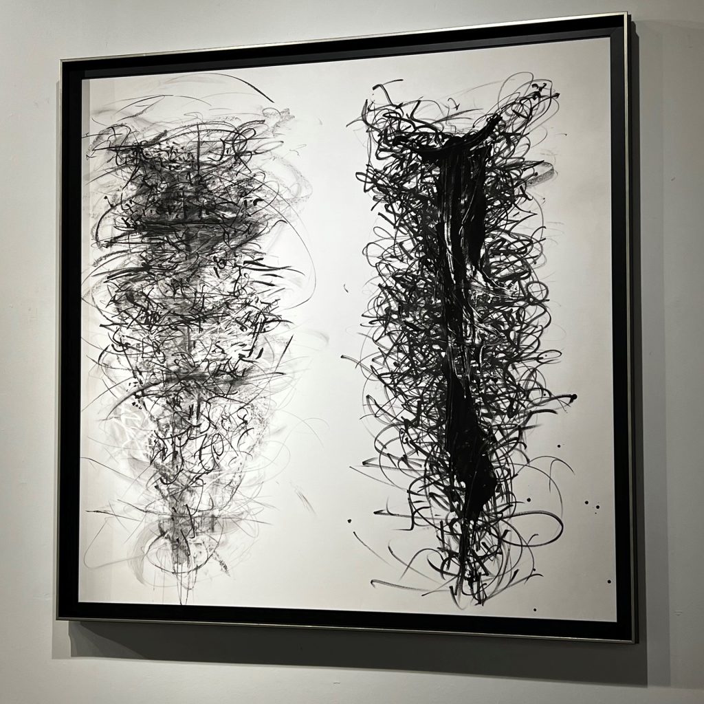 We printed the 40” x 40” art on paper, then mounted and laminated it so that it would not require glass or acrylic glazing. Together with the artist, we selected a modern black cap frame for her black and white artwork and then layered that within an elegant float frame, with a silver face, to give it a little extra depth and dimension.