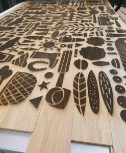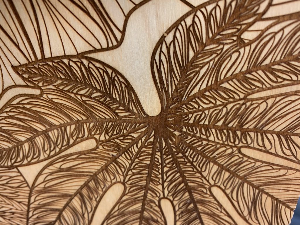 The adjacent photo is an example of how the surface etching process creates rich, gorgeous coffee-colored lines. Looking for a finished edge on your project? Laser cutting the perimeter of a wood piece naturally enriches the wood’s tone, eliminating the need for painting and staining.
