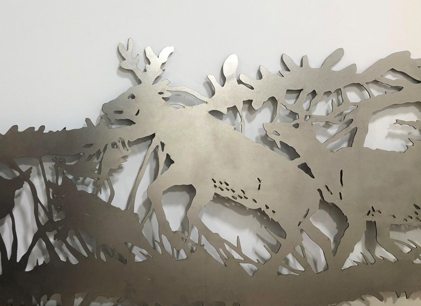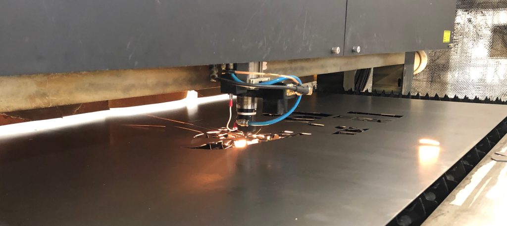 Our laser has cut and engraved amazing projects like a fabricated set of 8 ft. tall by 3 ft. in diameter tennis ball canisters later filled with giant tennis balls, laser etched wood cladding for restaurant walls, and laser cut acrylic fish with dichroic film that now hang from the ceiling of a children’s hospital. Whether our laser is in action creating artwork from a sheet of steel like in the photo above, or carving abstract details into a piece of walnut, the opportunities for customization are infinite.