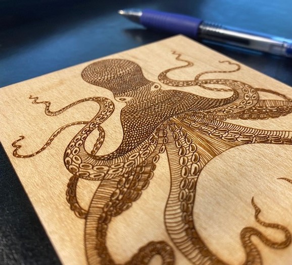 For projects taking creativity to new heights, our laser etching, engraving, and carving services can add endless dimension and texture. This laser-etched octopus measuring only 3 inches wide by 3 inches tall showcases the refined level of detail the laser is capable of producing.