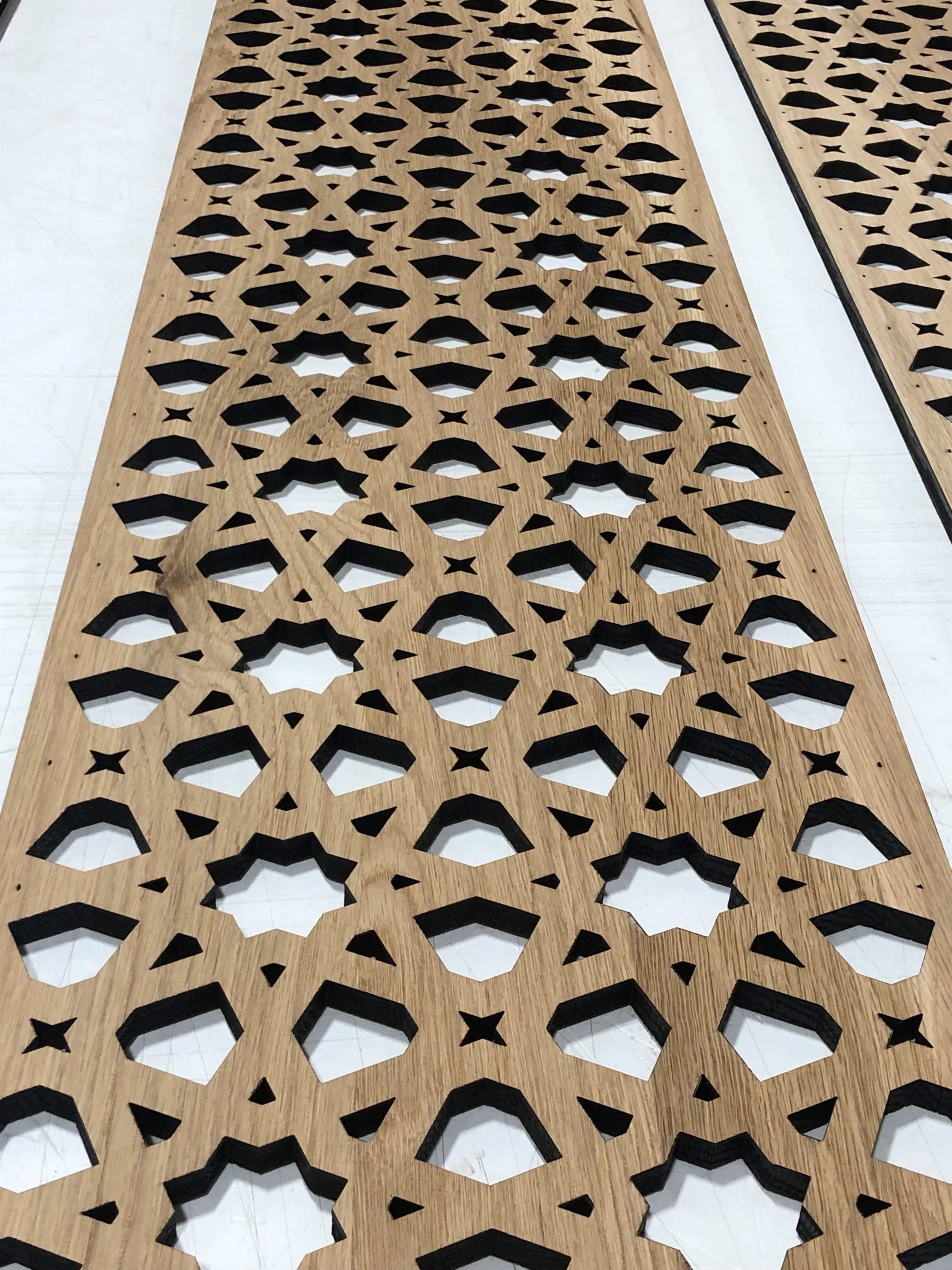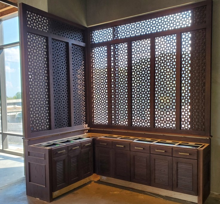 Recently, we have had the opportunity to produce a few out-of-the-box projects, using unique materials. With customers seizing the chance to gather in their favorite spaces now more than ever, there is an increased demand for minimizing residual noise. Working with talented hospitality designers to create an artistic solution, we laser cut this acoustic panel (shown to the right) into floral shapes for an upcoming installation. Cutting thick, fibrous material, like acoustic sound dampening panels, initially required several rounds of testing to perfect the exact look our clients envision. Now making the appropriate adjustments for each material is second nature to our technicians. In addition to acoustic panels, decorative screens laser cut from wood, metal, and colored acrylic are continuing to grow in popularity for hotel lobbies, restaurants and other public spaces.