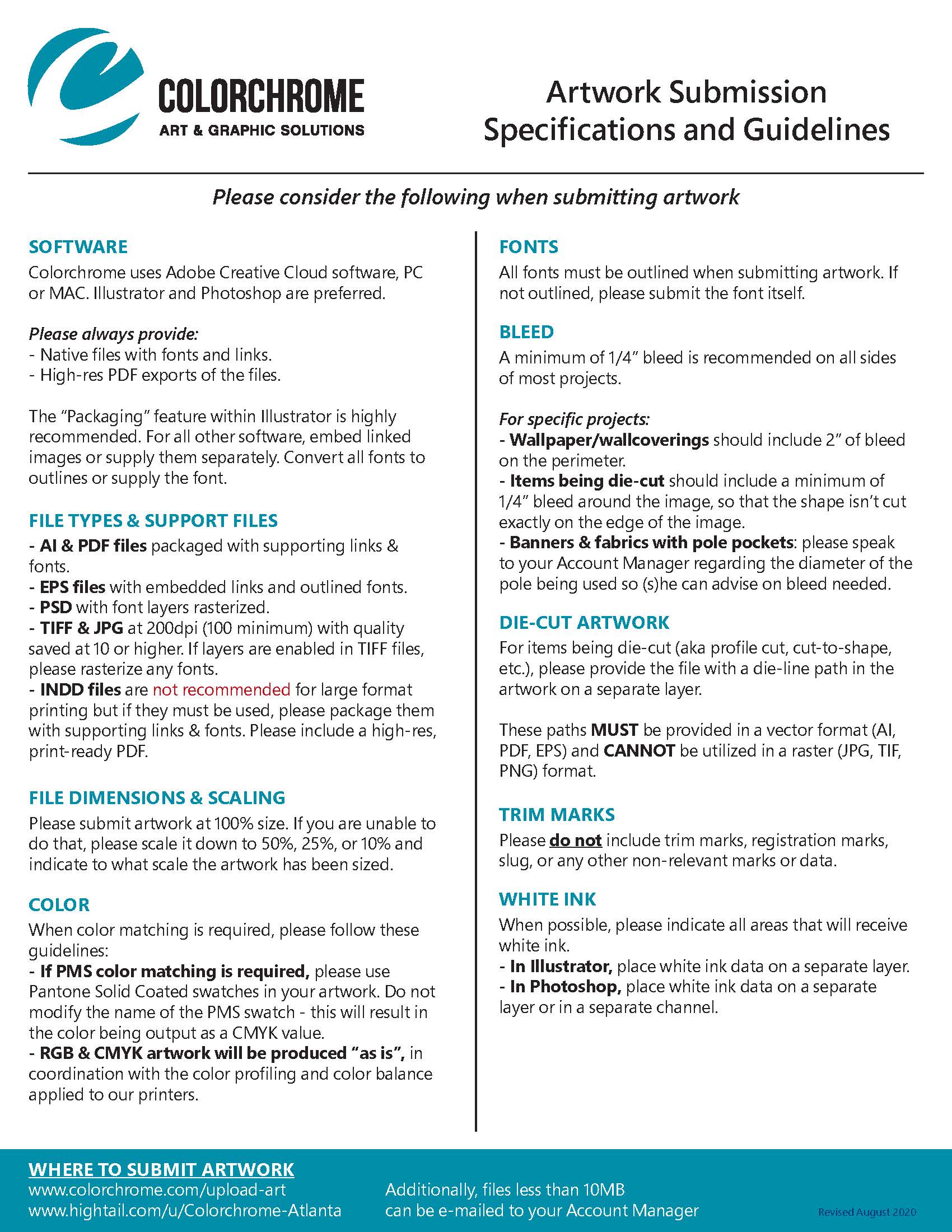 Complete the form below to be redirected to our Hightail account to upload your file(s).  Please note artwork submission specifications and guidelines below.  If this is your first order with Colorchrome, please enter New Client in the Account Manager cell on the form below.